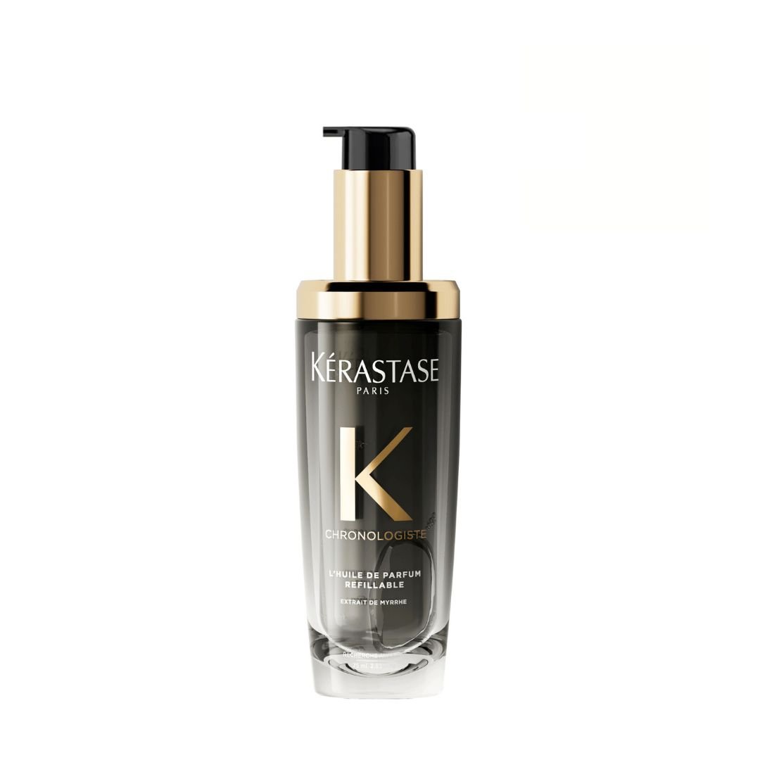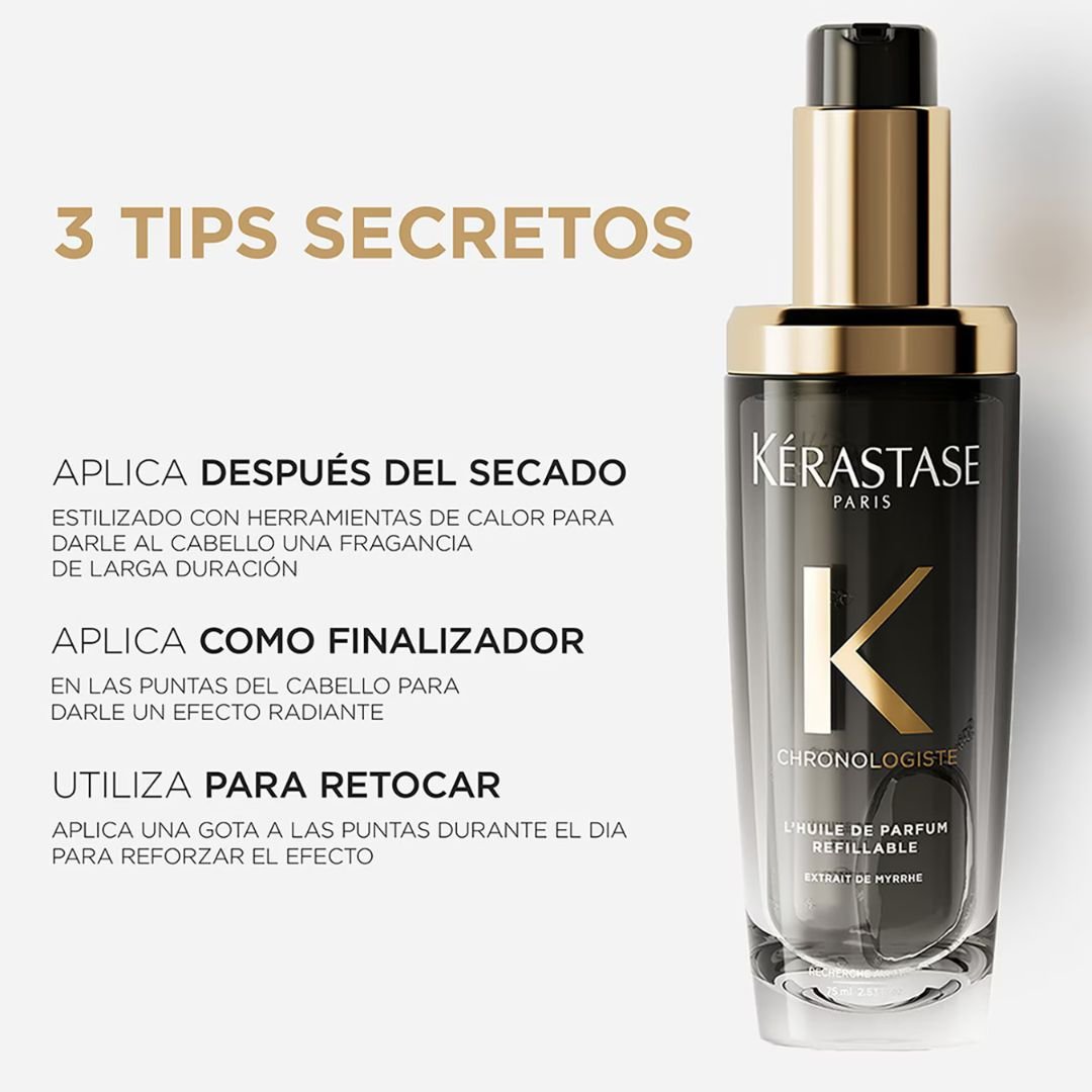 Perfume Kérastase Chronologiste L’Huile de Parfum – Recargable, con una infusión de extracto de mirra, es una fragancia en aceite para el cabello compuesta por una combinación excepcional de notas nobles del mundo de las fragancias finas: Rosa de Té, Maderas Ligeras y Almizcle.