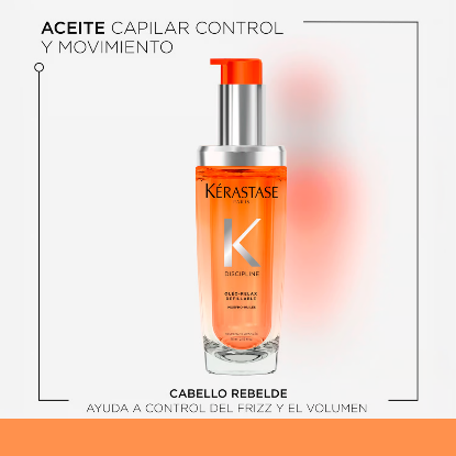 Aceite Disciplinante Anti Encrespamiento para cabellos Rebeldes Kérastase L´Huile Oleo Relax Discipline, creado para los cabellos secos y rebeldes, gracias a su tecnología reduce el encrespamiento, controla el frizz y como resultado un cabello más definido, más suave y más manejable.