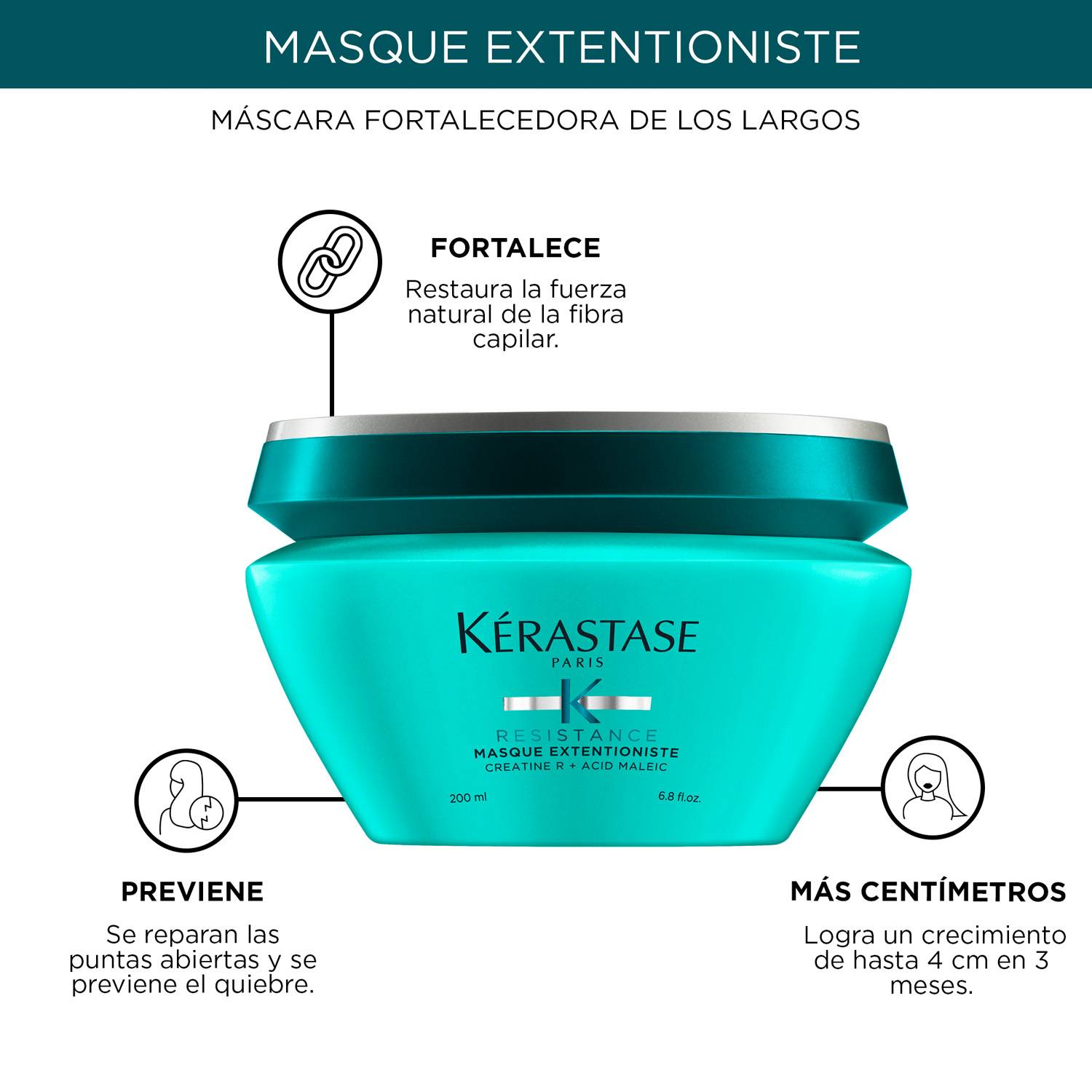 Los activos que recibe a través de la creatina R y el ácido maleico que contiene la fórmula ayudan a estimular la fibra capilar para reforzar el cabello hasta las puntas.