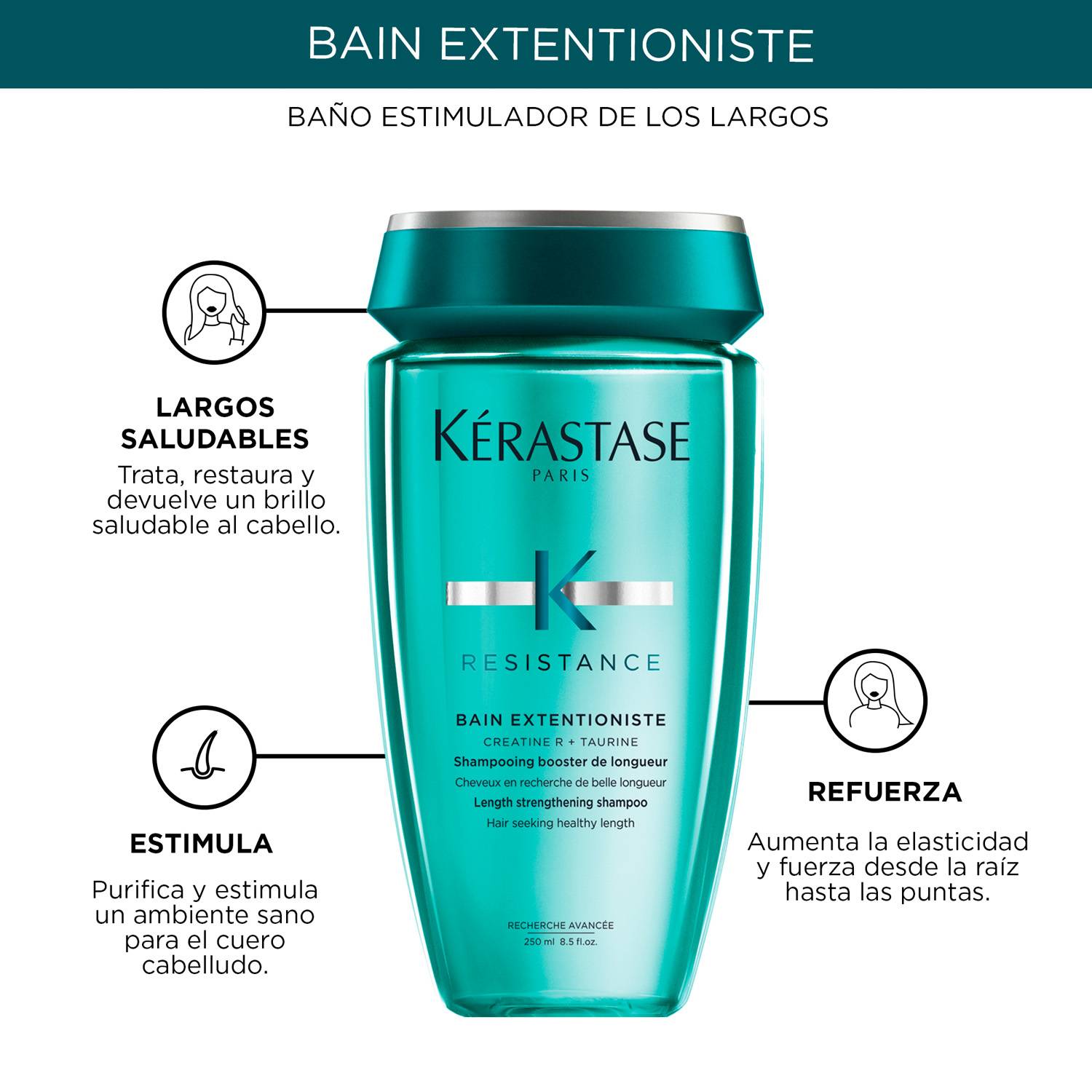 Un shampoo fortalecedor que estimula el crecimiento del cabello fuerte desde la raíz. El cabello debilitado propenso a quebrarse se fortalece a medida que su estructura interna se reconstruye y sella para proporcionar una mayor protección durante todo su crecimiento. Este shampoo purificador está enriquecido con creatina R, un complejo activo diseñado para mejorar la resistencia y la elasticidad, y taurina, un aminoácido que promueve un cuero cabelludo saludable. El cabello se limpia profundamente para alcanzar su longitud ideal en perfectas condiciones.