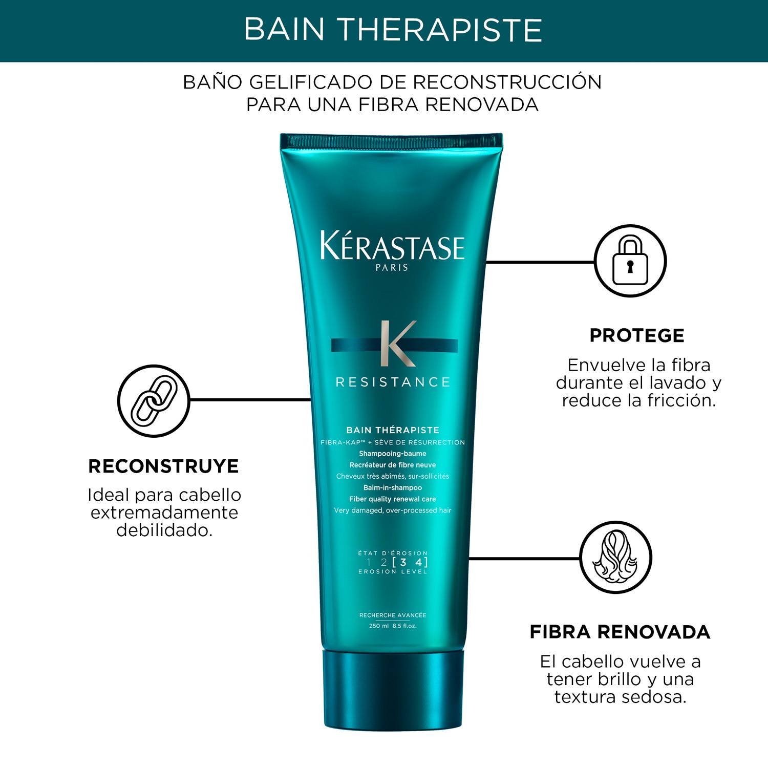 Bain Thérapiste es un shampoo diseñado para cabellos muy dañados y demasiado procesados. Recubre la fibra durante el lavado para brindar profunda revitalización, brillo y suavidad.