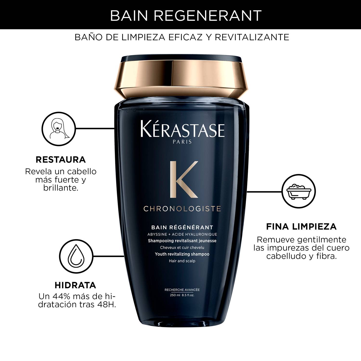 Shampoo para cabellos desvitalizados. Este tratamiento de alta calidad refuerza y suaviza la fibra capilar