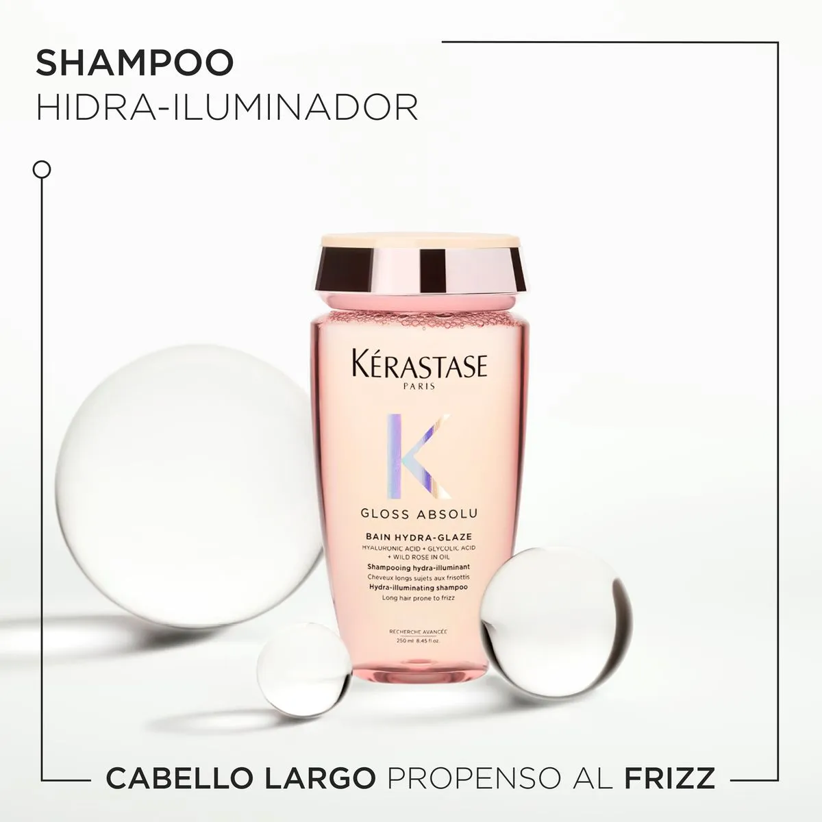 Shampoo Hidratante Anti Frizz con Efecto de Brillo Kérastase Bain Gloss Absolu Hydra – Glaze, creado para cabellos con tendencia al encrespamiento e indisciplina, su fórmula, a base de ácido hialurónico, ácido glicólico y extracto de rosa silvestre, te proporciona un cabello disciplinado, suave, ligero y con un extraordinario brillo.Su fórmula en textura gel con alta espuma limpia el cuero cabelludo y la superficie de la fibra capilar como resultado un brillo extraordinario. Hidrata y sella las cutículas para crear una superficie increíblemente suave. La fragancia, una mezcla de alta costura inesperada, donde se unen notas cítricas vibrantes con la firma de un lujoso ramo floral, una combinación de tecnología capilar y arte perfumista para una experiencia ultra sensorial y única.
